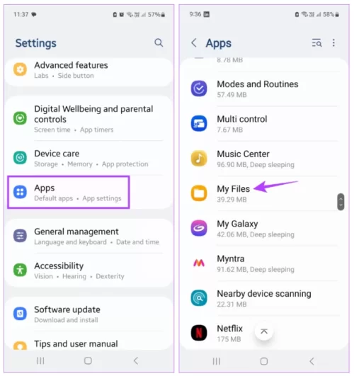 Cihazınız belirli Dosya Yöneticisi uygulama işlevlerini kısıtlıyorsa, uygulama aralıklı olarak durabilir. Android telefonunuzda Ayarlar uygulamasını açın ve Dosya Yöneticisi uygulamasının kısıtlamasız çalıştığından emin olun. Bunu yapmak için aşağıdaki adımları izleyin.Adım 1: Ayarlar → Uygulamalar → Dosyalarım'a gidin.