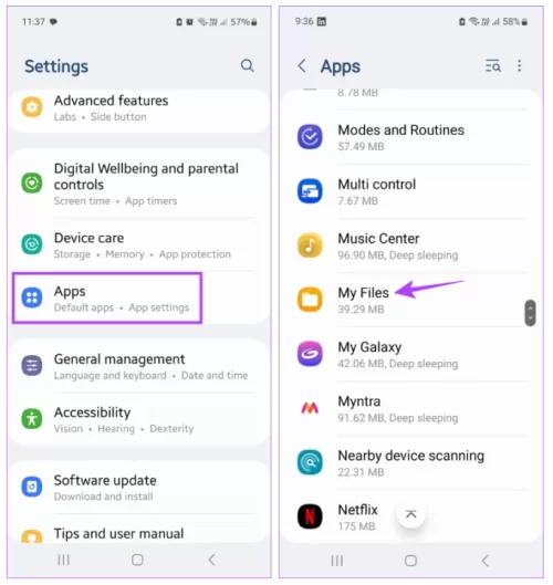 Çoğu Android uygulaması, uygulamanın daha hızlı ve verimli çalışmasını sağlamak için zamanla önbellek toplar. Ancak bu önbellek bozulursa, uygulamaların çalışması durabilir. Dosya Yöneticisi uygulamanızda bu sorunla karşılaşıyorsanız, uygulama önbelleğini temizleyin ve ardından uygulamayı kullanın. İşte nasıl yapılacağı.Adım 1: Ayarlar'ı açın ve Uygulamalar'a dokunun. Burada Dosyalarım'a dokunun.