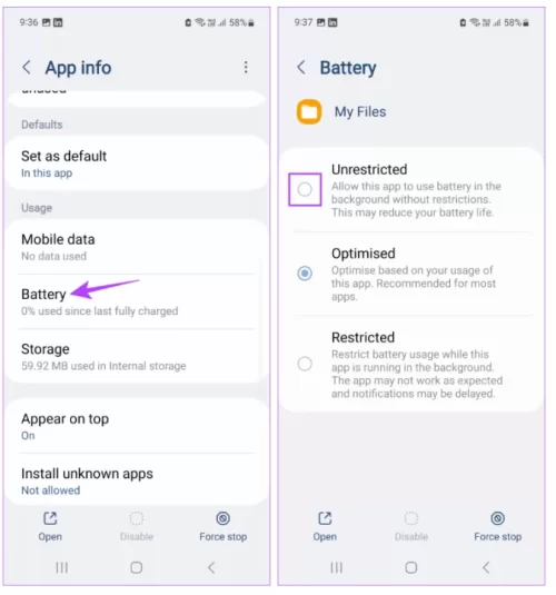 Adım 2: Burada Pil'e dokunun → Sınırsız'ı seçin.