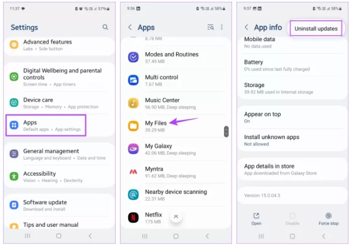 Android telefonunuzdaki Google Dosyalar uygulaması güncellemelerini kaldırma adımlarını da izleyebilirsiniz. Ardından, sorunun çözülüp çözülmediğini görmek için ilgili Dosya Yöneticisi uygulamasını tekrar açmayı deneyin.