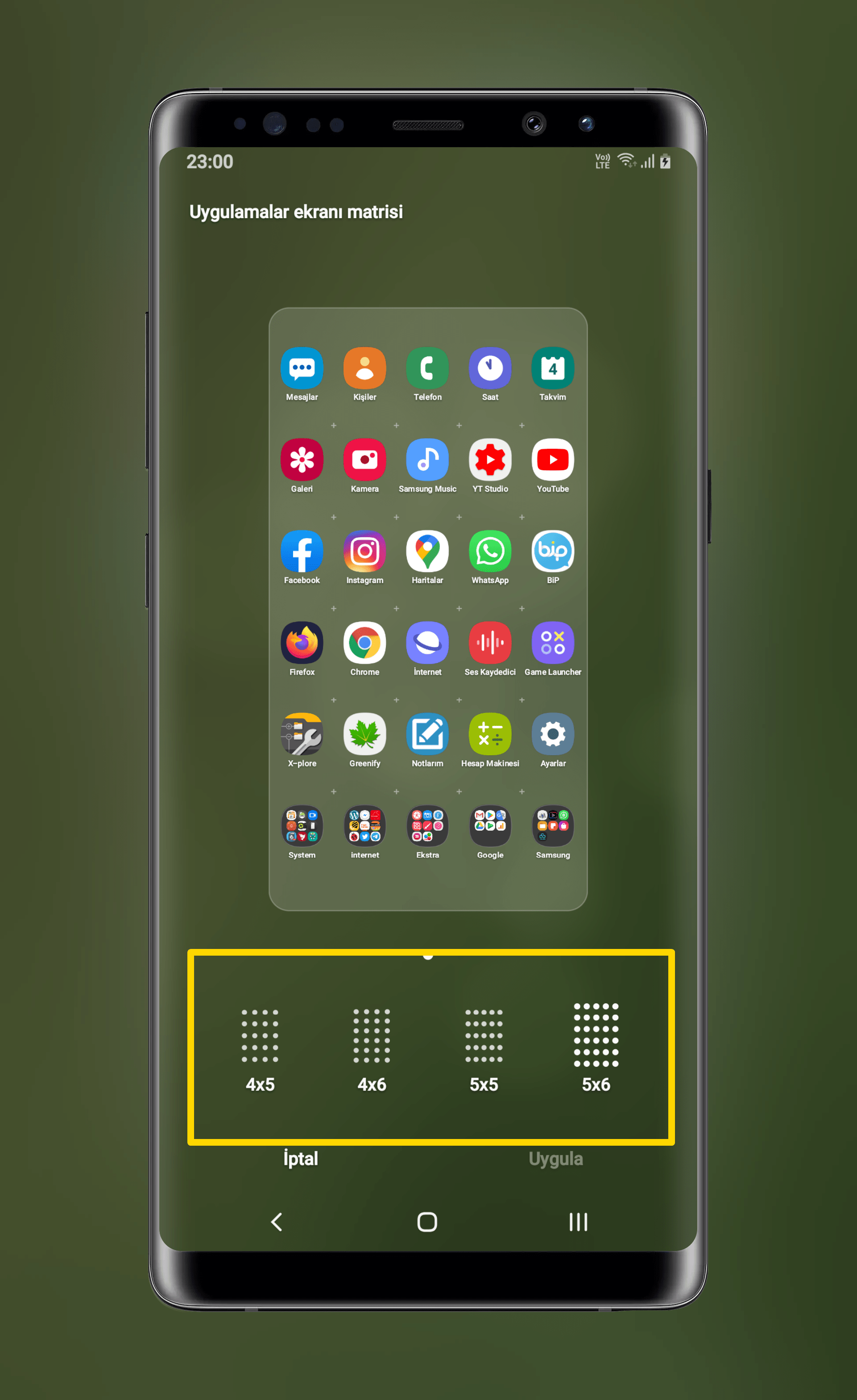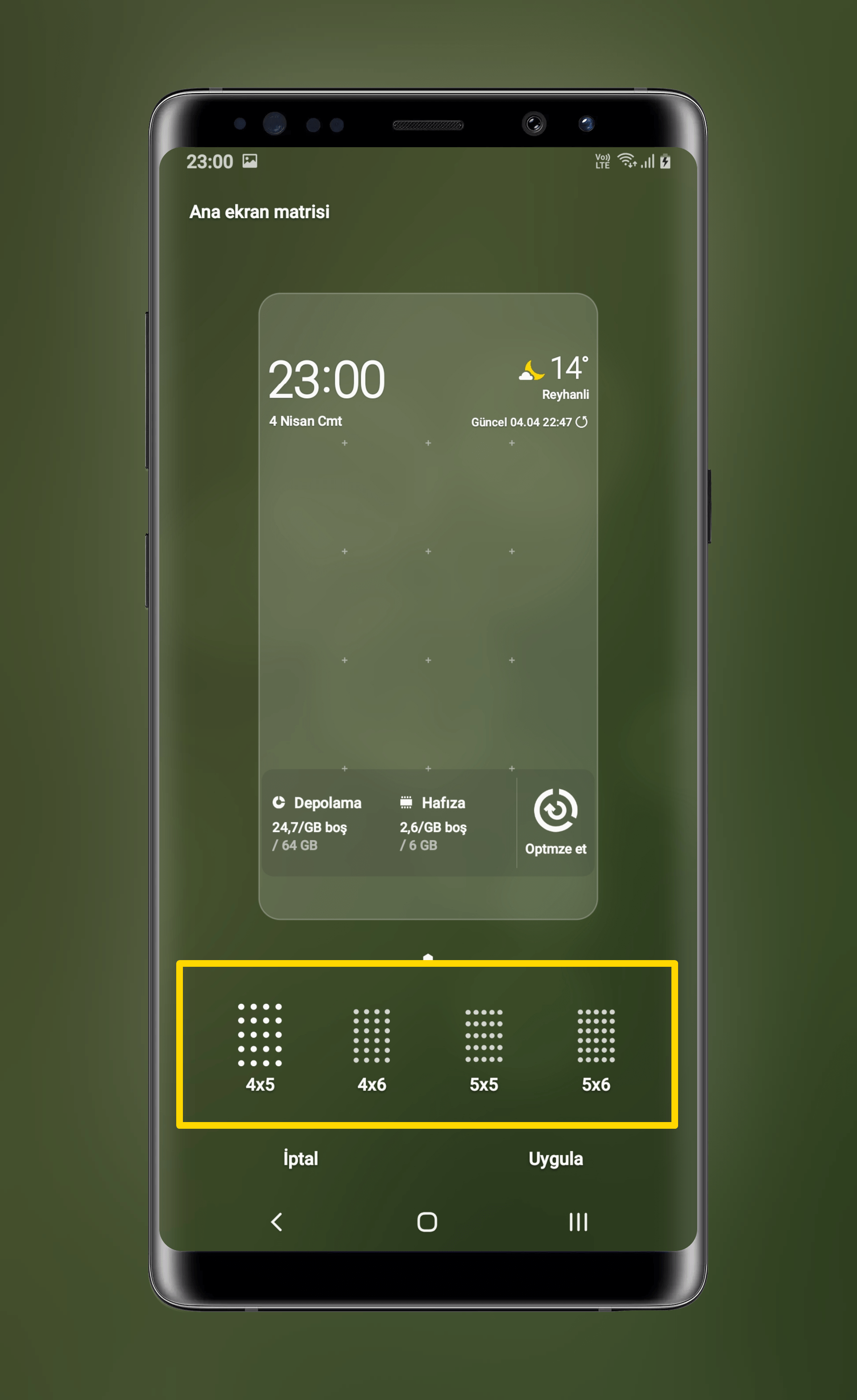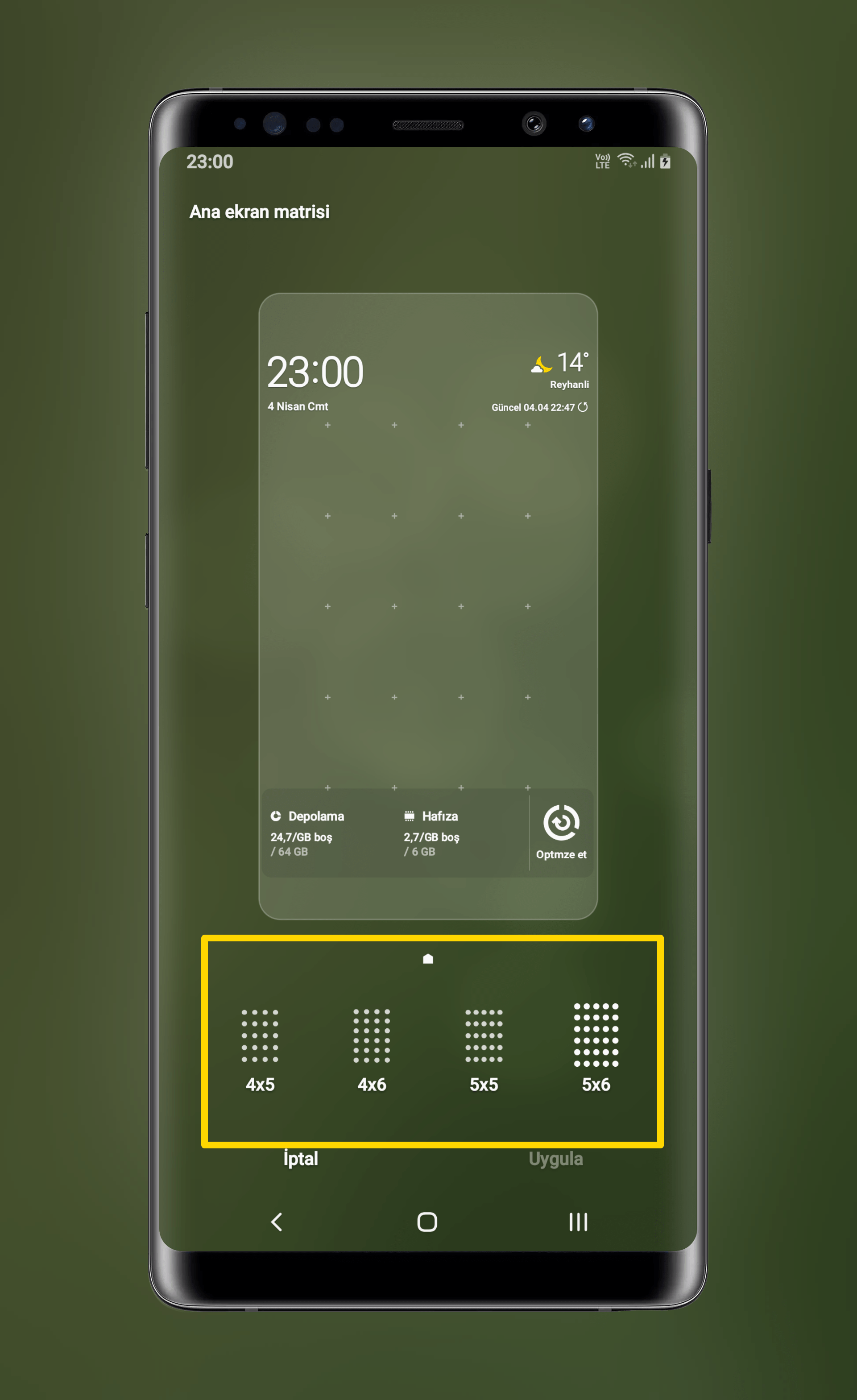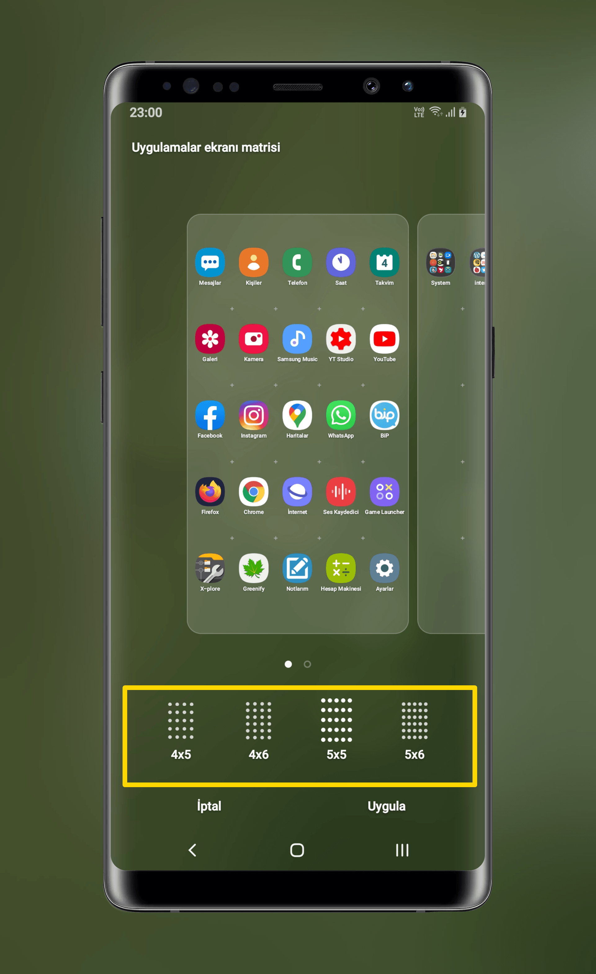 Uygulamalar Ekranı Matrisi :Uygulamalrın oldugu kısımdaki simge boylarına ve sayfa başı düzecek uygulama sayısını ayarlamanıza olanak saglamaktadır. Bunu biraz daha açıklamak gerekecek olursa, Sayfa başı düzen uygulama sayısı düştük sıra sige boyu da bu orantıda büyümektedir.