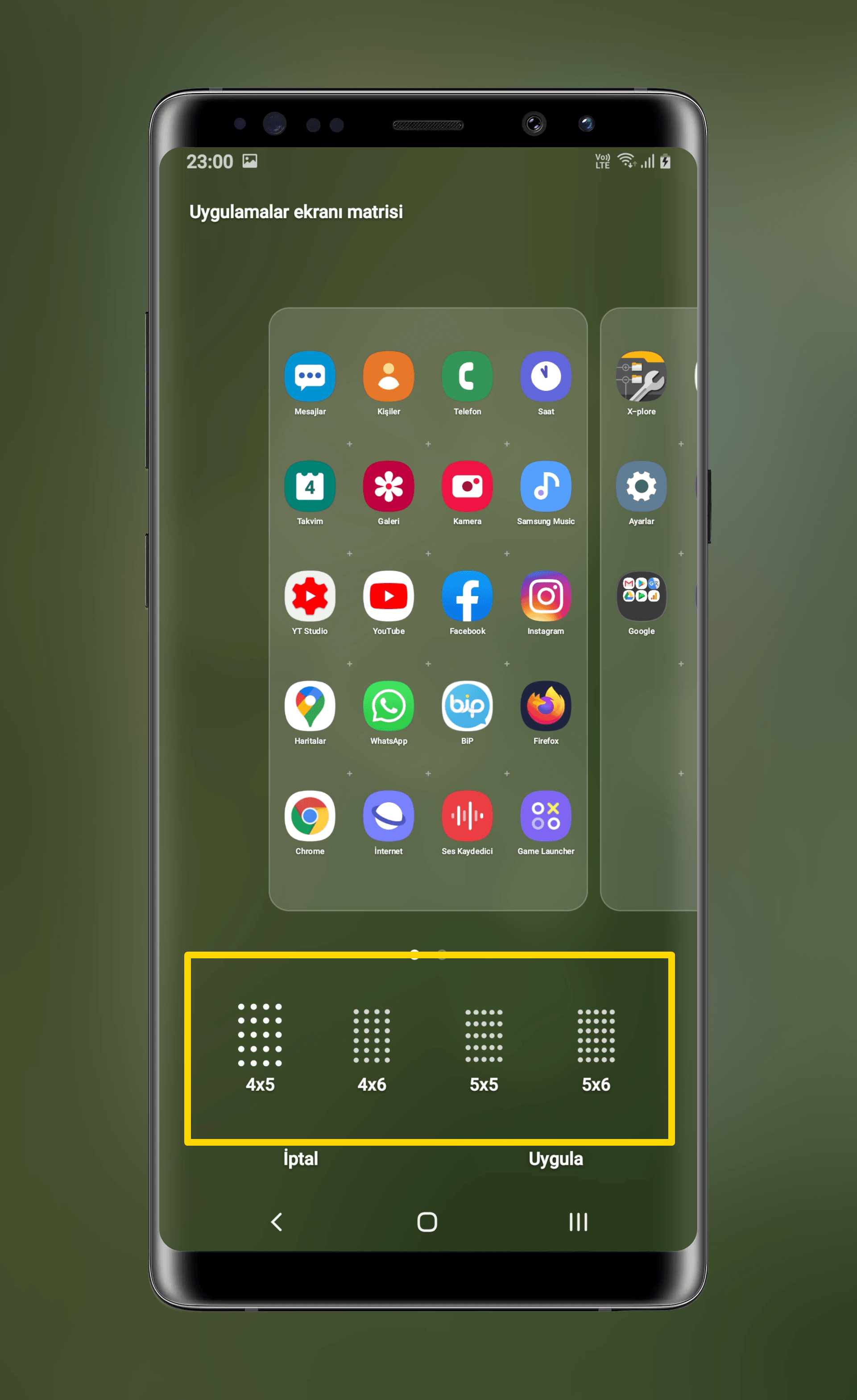 5. Şimdi gelin seçimlerin nasıl göründüğüne hep birlikte bakalım. 4×5 ve 5×6 arasında nasıl bir fark olduğunu anlamak için sizler için hazırlamışolduğumaşağıdakiresimlere bakabilirsiniz. 4×5 seçildiği zaman simgeler daha büyük olmaktadır. Simgelerin büyümesi demek sayfa başına düşecek uygulama simgesinin de azalması demektir.Ben kendi cihazımda 5×6 kullanmaktayım bunun sebebi ise sayfa başı düşen uygulamanın artmasını sağlamaktır. Sizler dilediğiniz ayarları kullanabilirsiniz.
