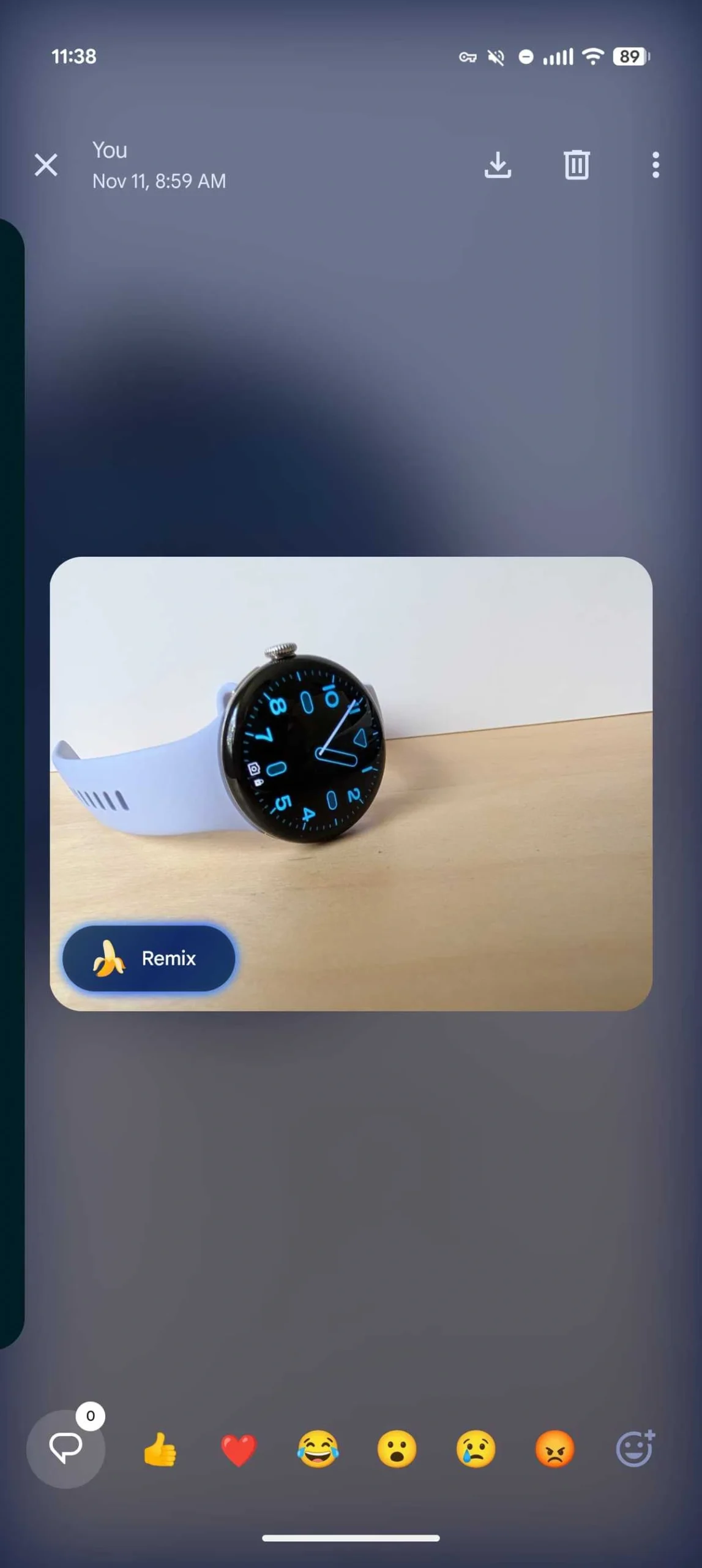 Aynı önizlemede, hızlı tepkiler için emojilerle eşleştirilmiş bir Nano Banana Remix düğmesi de yer alıyor. Üst kısımda, görseli kimin ne zaman paylaştığını ve görseli indirme veya silme seçeneklerini de görebilirsiniz.